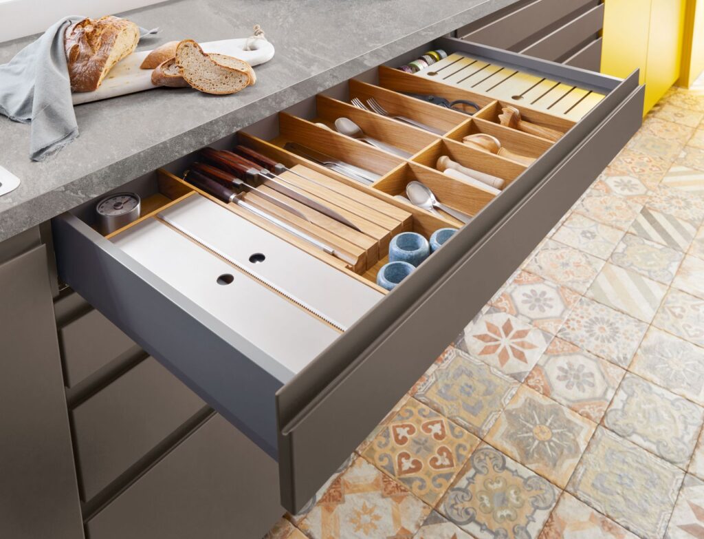 More space, especially if there is no basement in the house, a utility area integrated into the kitchen is an excellent option. With special modules and inserts, we look for solutions for a wide range of needs. The shelves for bottle crates, where the crates can be placed on their side, allow you to conveniently remove the bottles when you need them. The fruit boxes are not only beautiful, but also offer space to store potatoes, apples, etc. The set is completed with cross inserts for bottles, open shelves for cleaning products, and closed cabinets for greater peace of mind. In addition, with our kitchen collection, the utility area can be designed perfectly to meet your needs!