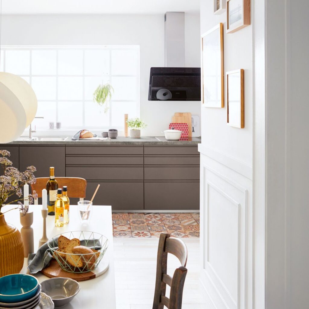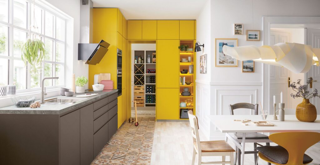 Our kitchen furniture in neutral Havana brown integrates perfectly against the wall, leaving room for an exceptional detail: a perfectly bright yellow utility area that offers additional storage space. In this kitchen, everything is perfectly organized.
