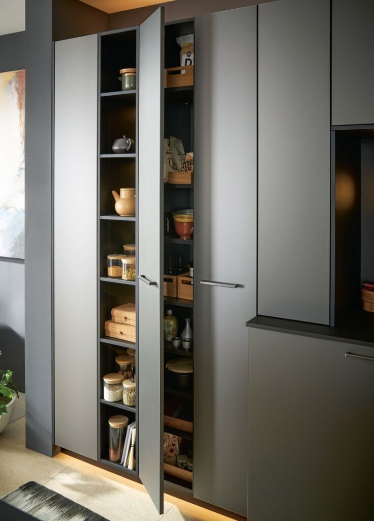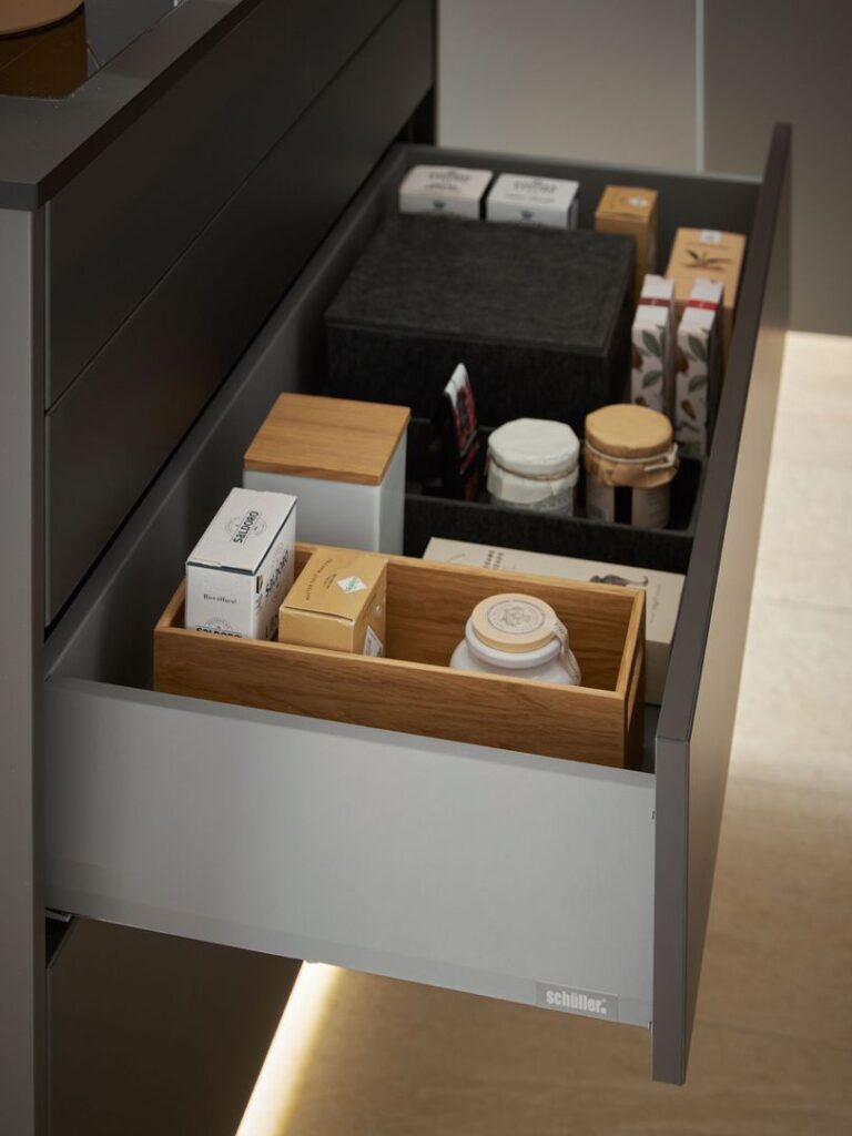 The child-friendly fronts have a relaxing effect. Convenience is guaranteed by the hinged sockets, the downdraft extractor, the open shelves with elegantly illuminated support panel and the extra-deep tall cabinets, which are aligned with the tall cabinets and offer ample storage space.
