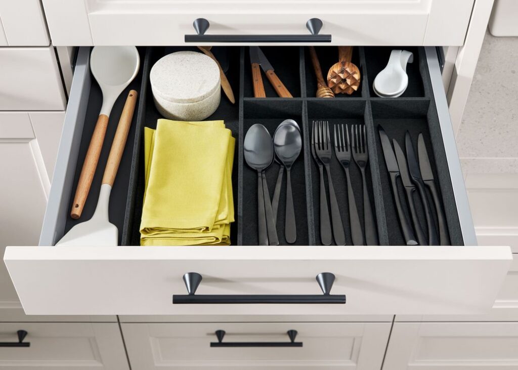Luego están los accesorios a juego opcionales: los insertos de cajón OrganiQ hechos de materiales sostenibles como cáñamo y kenaf están disponibles en una gama de modelos, y el riel empotrado puede albergar un soporte para rollos de cocina, un espacio de almacenamiento para vinagre y aceite y muchas otras características útiles.