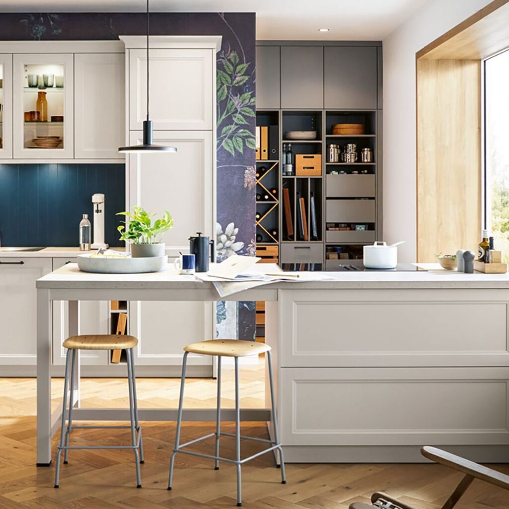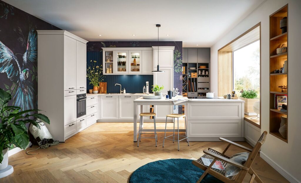 Abierto a la vida: los frentes claros en satén blanco concha realzan el carácter rural y moderno de la cocina. Esto se realza aún más con la cornisa de los muebles altos y altos con estante final, mientras que la isla de cocina con su estructura de mesa extensible aporta orden a la estancia.