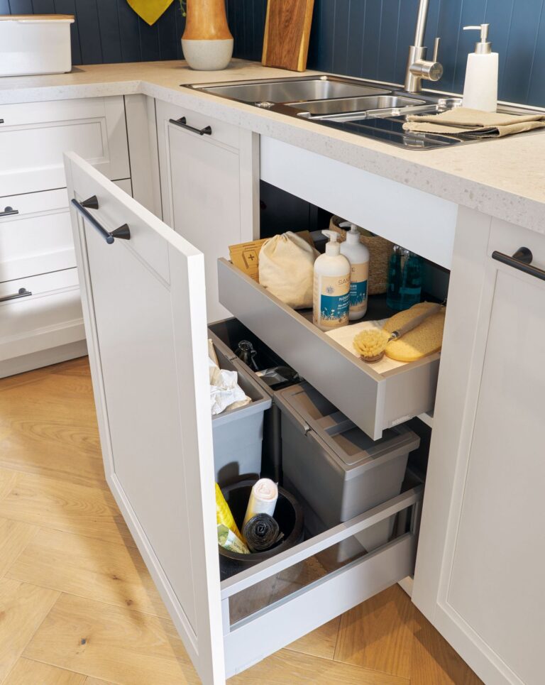 El mueble de fregadero extra ancho con su división frontal simétrica ofrece suficiente espacio para fregaderos grandes y gestión de residuos.
