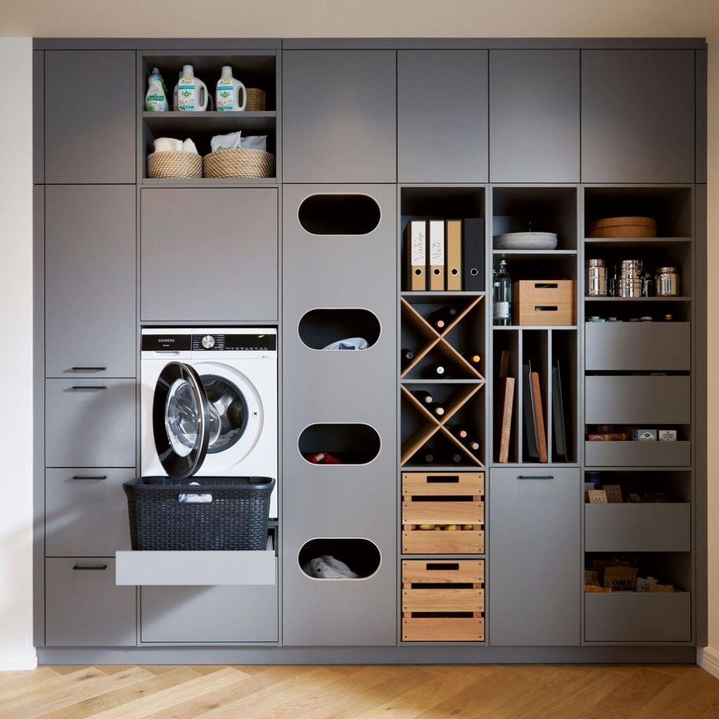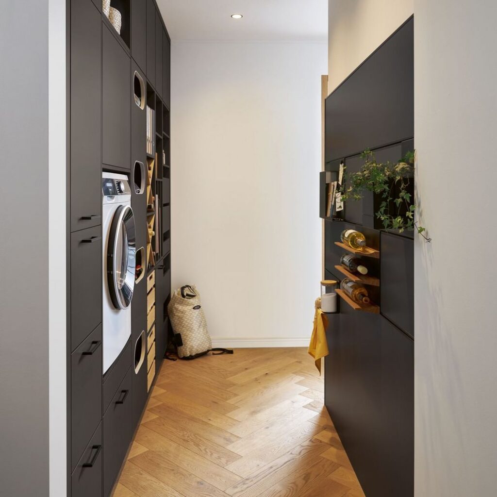 Tanto si dispone de una habitación independiente como si prefiere una solución lineal, nuestro concepto modular de armarios altos y extraíbles ofrece soluciones a medida para la organización del hogar. La lavadora, la secadora, los zapatos y las bolsas para reciclar se pueden colocar de forma ergonómica y discreta. Al igual que su ropa, gracias al práctico armario de clasificación con aberturas para colocarla en las cestas de ropa ocultas de la parte inferior.