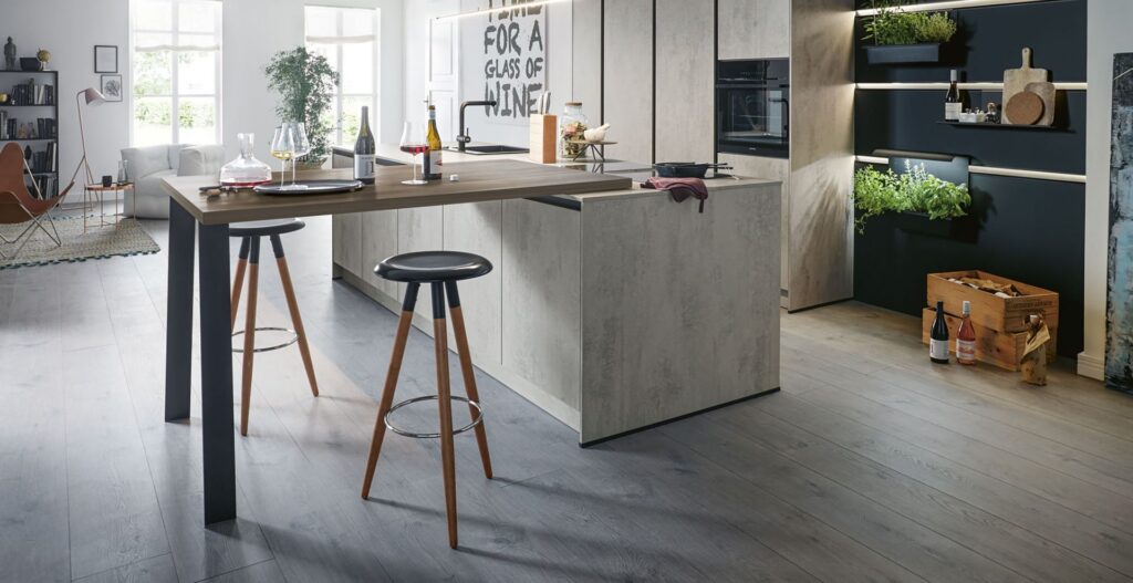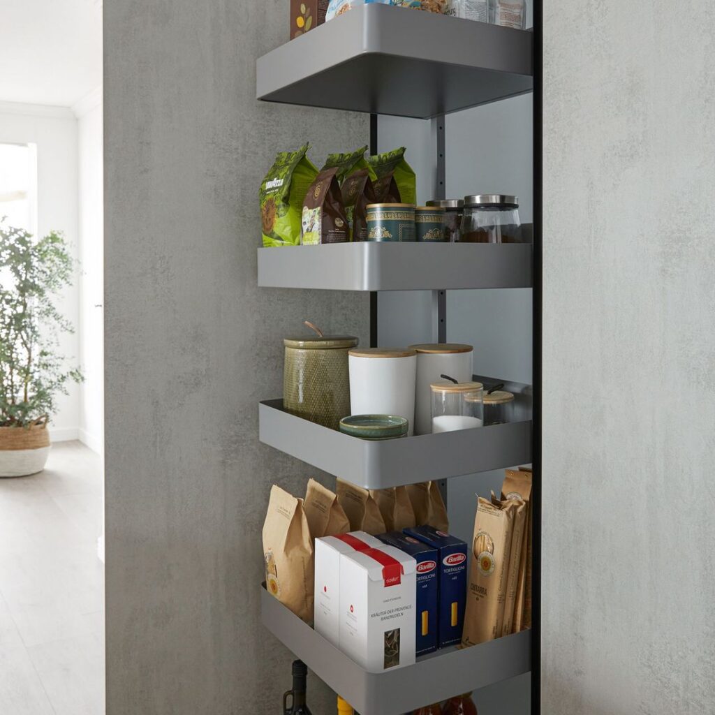 Gracias al armario alto con despensa extraíble, la cocina también resulta atractiva por dentro gracias a su amplio espacio de almacenamiento. El inserto con Flex-Boxes de roble natural garantiza el orden en cajones y gavetas. Los tiradores horizontales y verticales en negro ónix realzan la serenidad del conjunto. La guinda del pastel la pone la encimera extrafina, del mismo material que la cocina.