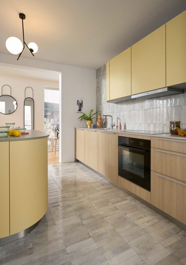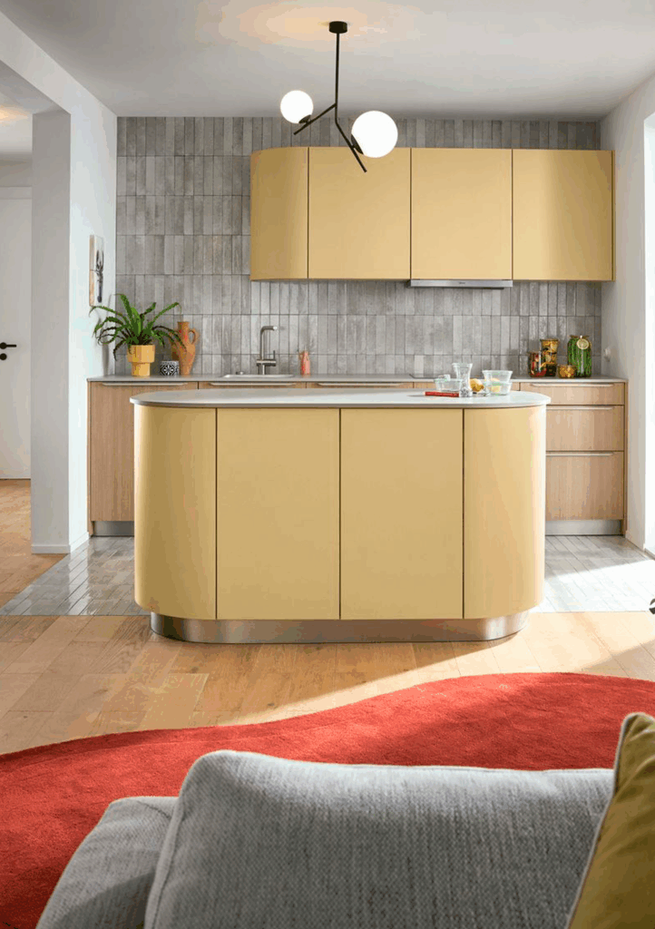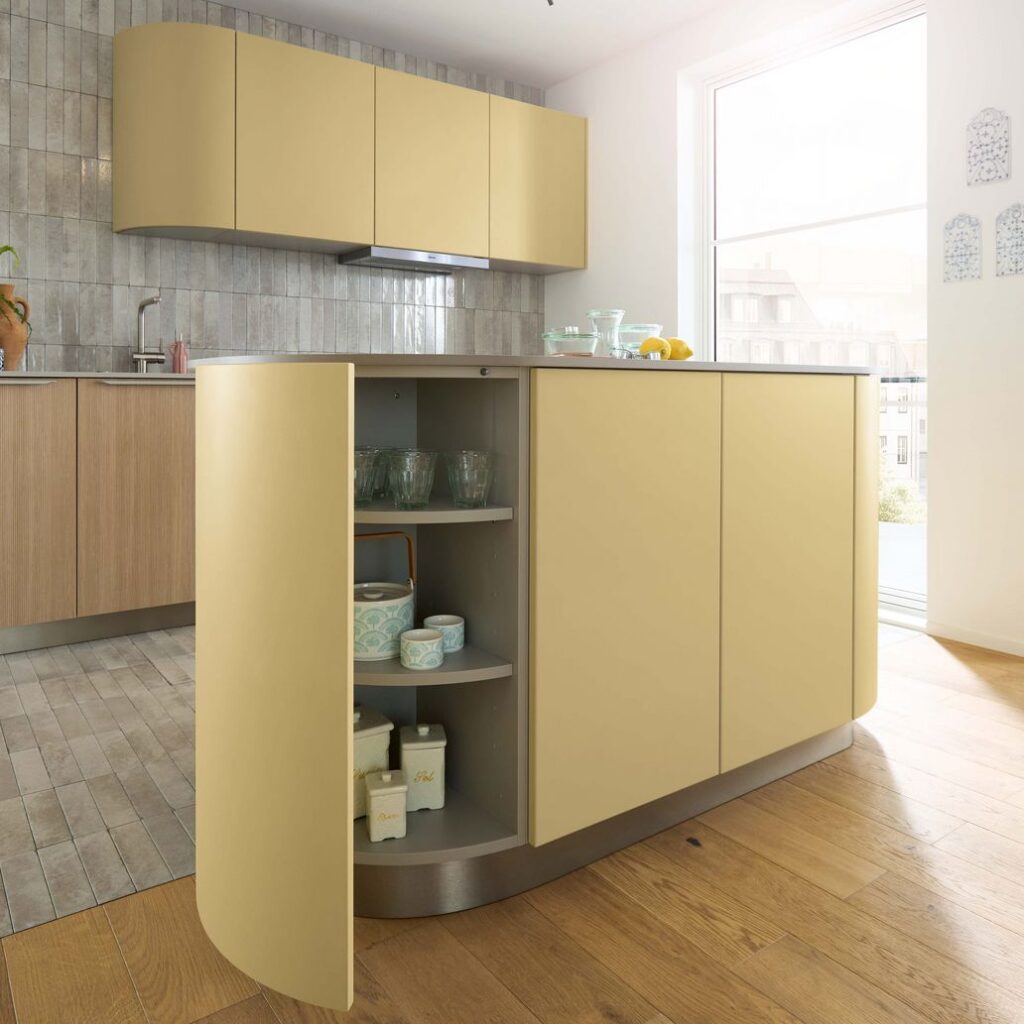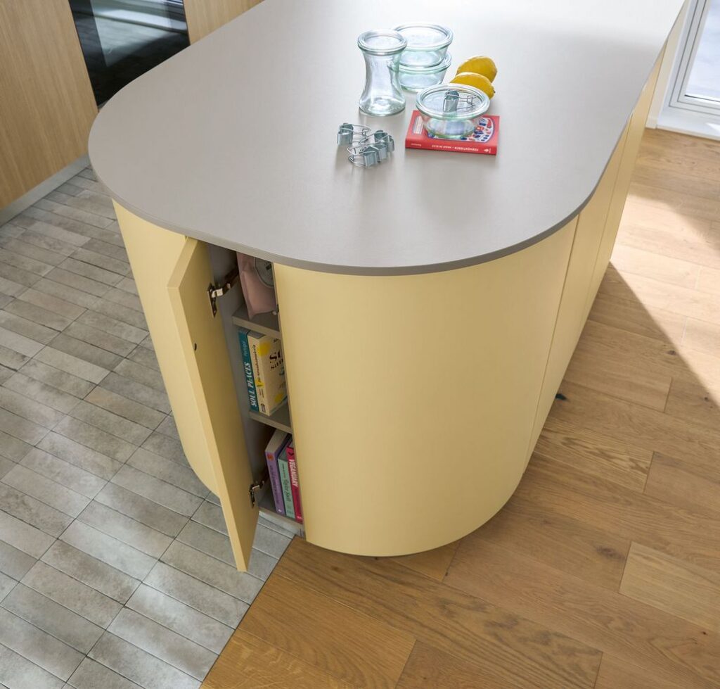 Muebles altos en tonos pastel con un extremo curvo. Esta agradable combinación encantará incluso donde el espacio y el dinero son escasos: los elegantes muebles Rondo, con su forma compacta, ofrecen un amplio espacio de almacenamiento y permiten que la isla de cocina se integre armoniosamente con el diseño general.