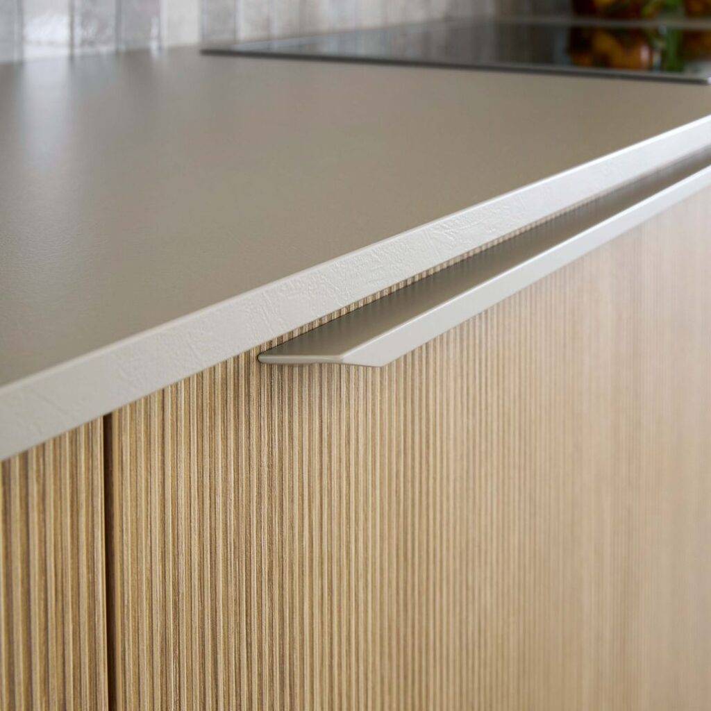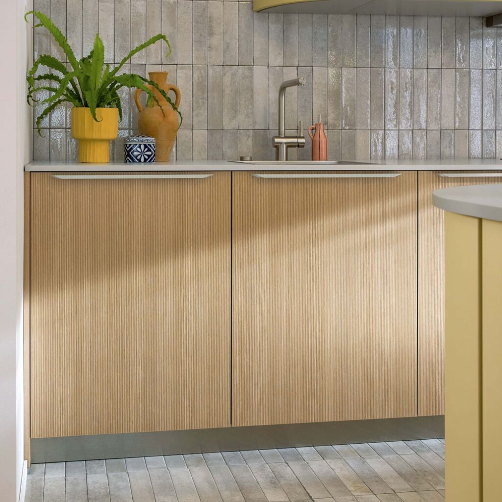 Una fila de unidades base con un aspecto de madera ranurada ultramoderno y repisas de agarre de diseño en todo el frente.