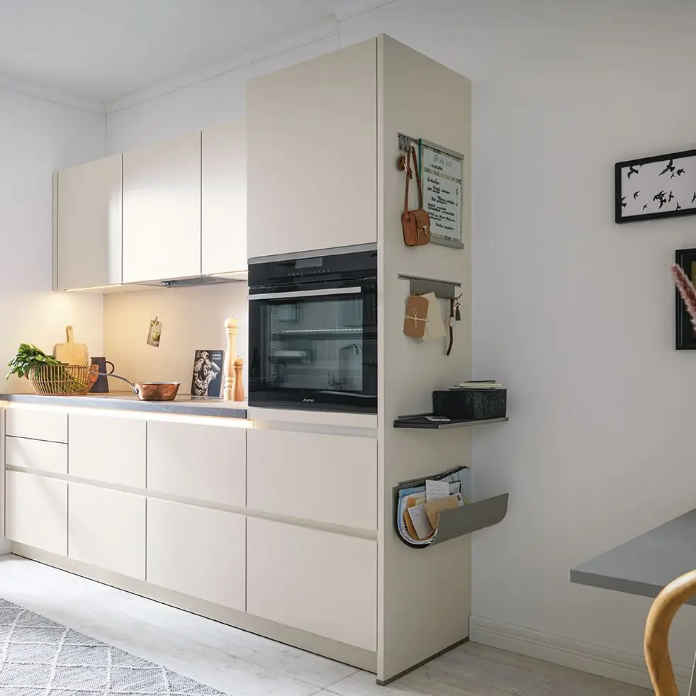El espacio de almacenamiento no siempre tiene que estar oculto, a veces también es claramente visible y muy decorativo: gracias al panel empotrado y al Orga Wall, se utiliza como un práctico ayudante en la vida cotidiana para bolígrafos, llaves y otros.