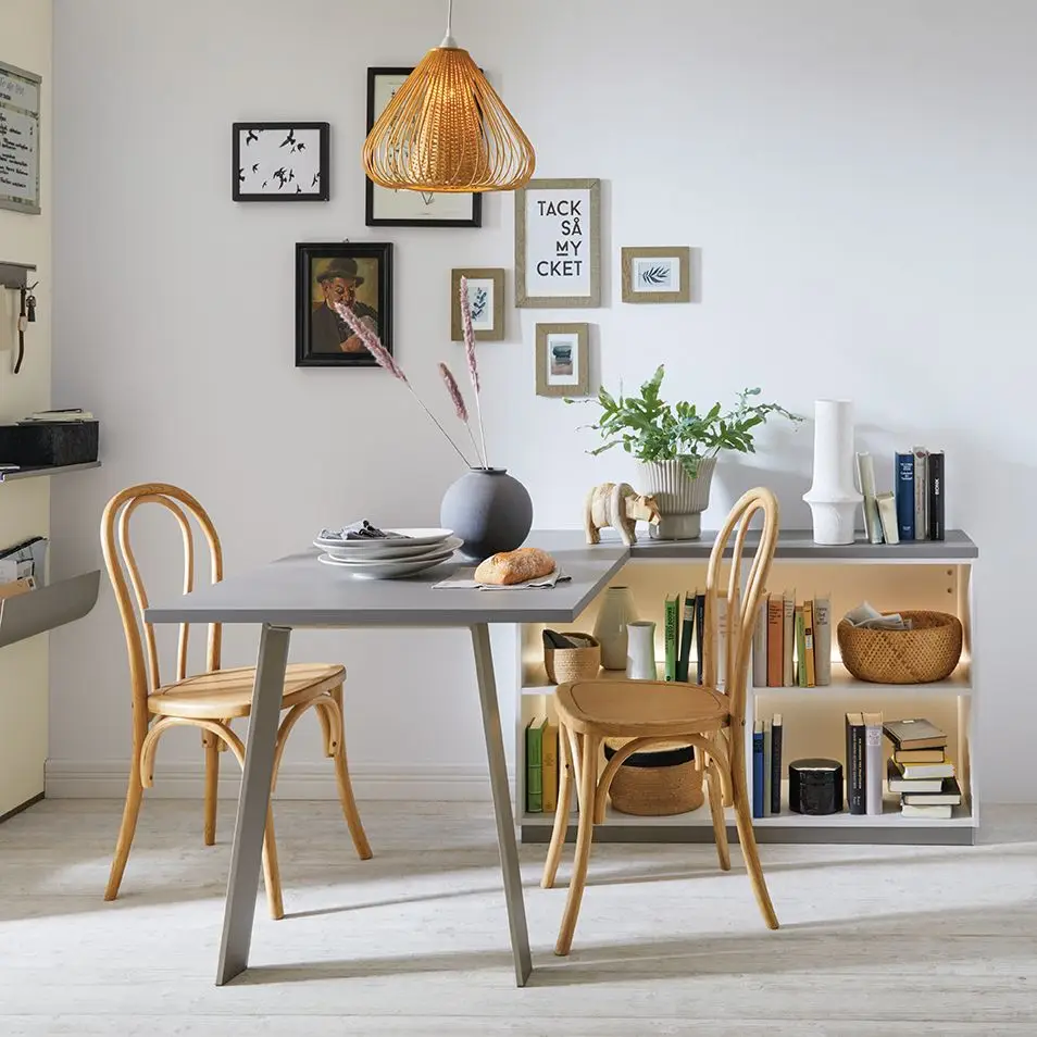 También hay espacio para una zona de comedor: planificada de forma compacta con una mesa que presenta elegantes patas de acero inoxidable.